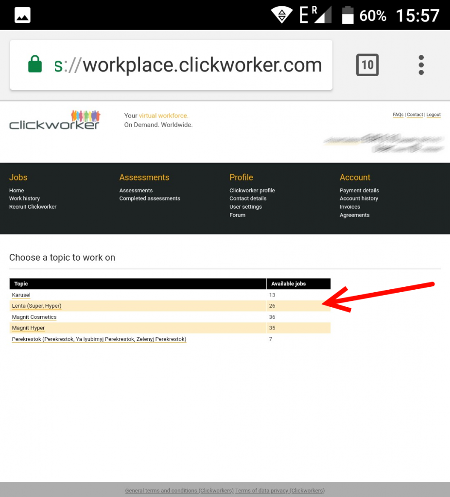 Берем смартфон, открываем браузер и переходим на сайт Clickworcker, вводим свои регистрационные данные.