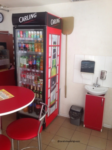За процессом приготовления пиццы, гости могли бы наблюдать со своих мест – печь расположена за стойкой, на виду. И, примерно таким же по площади, виделось мне, служебное помещение, в котором расположены заготовочный цех, раздевалка и санузел.