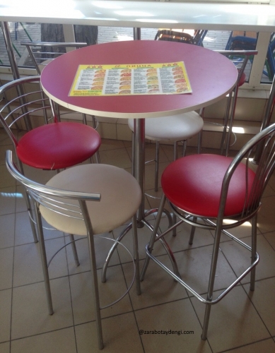 В центре зала, поставил два высоких столика, с круглыми столешницами и 14 барных стульев, равномерно разместили под столами. Стулья обошлись мне по 1500 рублей за штуку, а барные столы по 1850 рублей каждый.