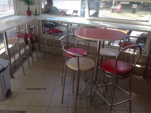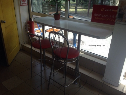 Исходя из такой архитектуры, я решил сделать столы для посетителей, из порезанных под размер, кухонных столешниц. Заднюю часть которых закрепил к металлопластиковым рамам оконных переплетов, на уровне 110 см от пола, а переднюю, с помощью пятидесятимиллиметровой мебельной трубы и фланцев, закрепил в пол.