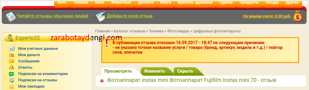 Для заработка на этом сайте понадобится много времени и терпения. Нужно быть готовым к блокировке отзывов и что придется их переделывать. Отзывы нужно писать регулярно, иначе денежные средства за просмотры Ваших отзывов не будут начислять.