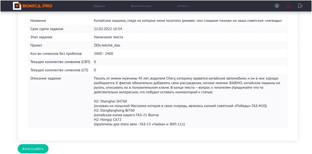 Здесь мы видим подробное описание задачи, сколько символов требуется и наименование проекта, для которого предназначена задача. В основном, тексты пишутся для каналов Яндекс.Дзен.